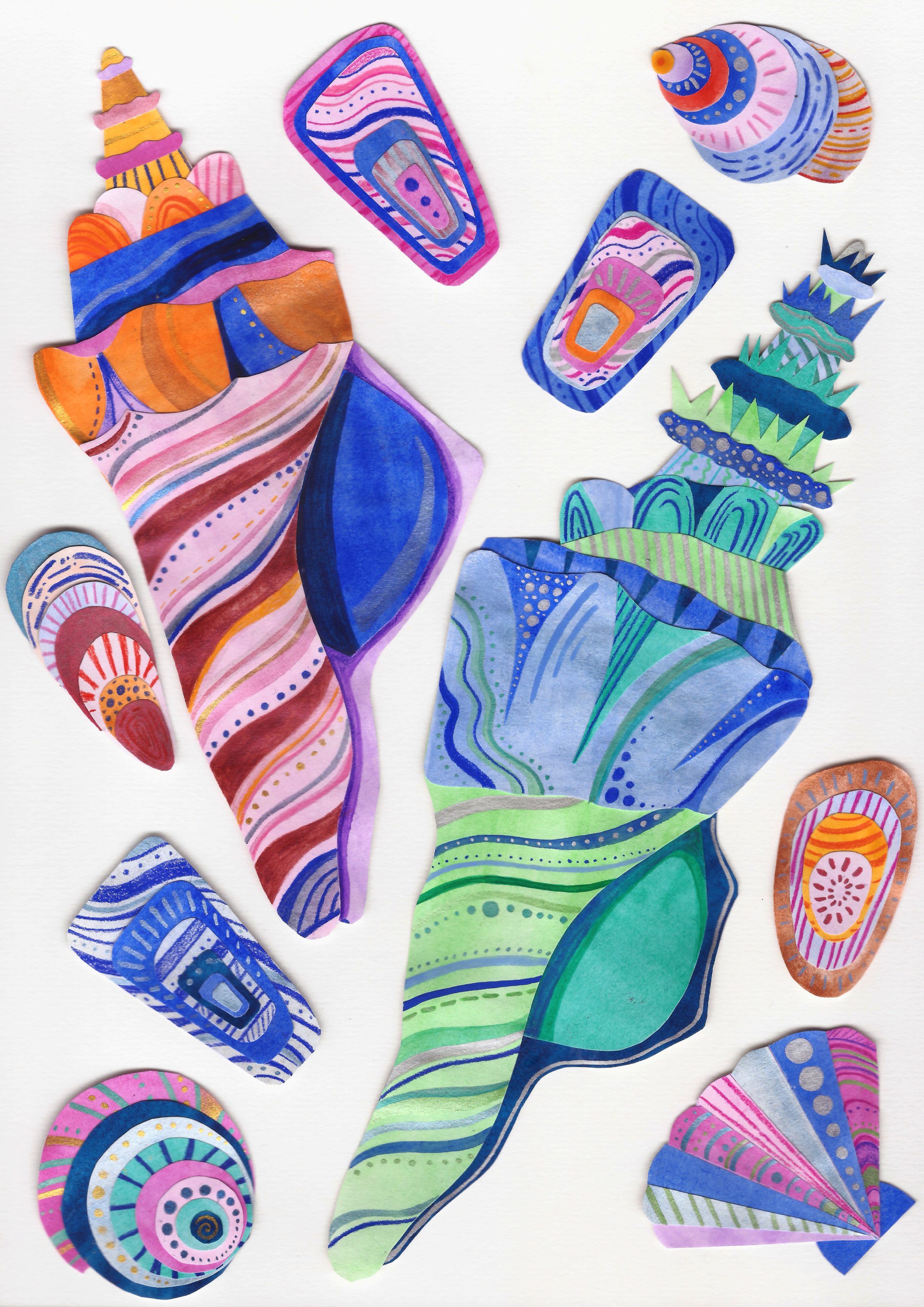 These are some seashell collages I made out of gouache paint, watercolours, coloured pencil and felt tip pen. I really wanted to recreate the vibrancy and textures found in the sea through paper.